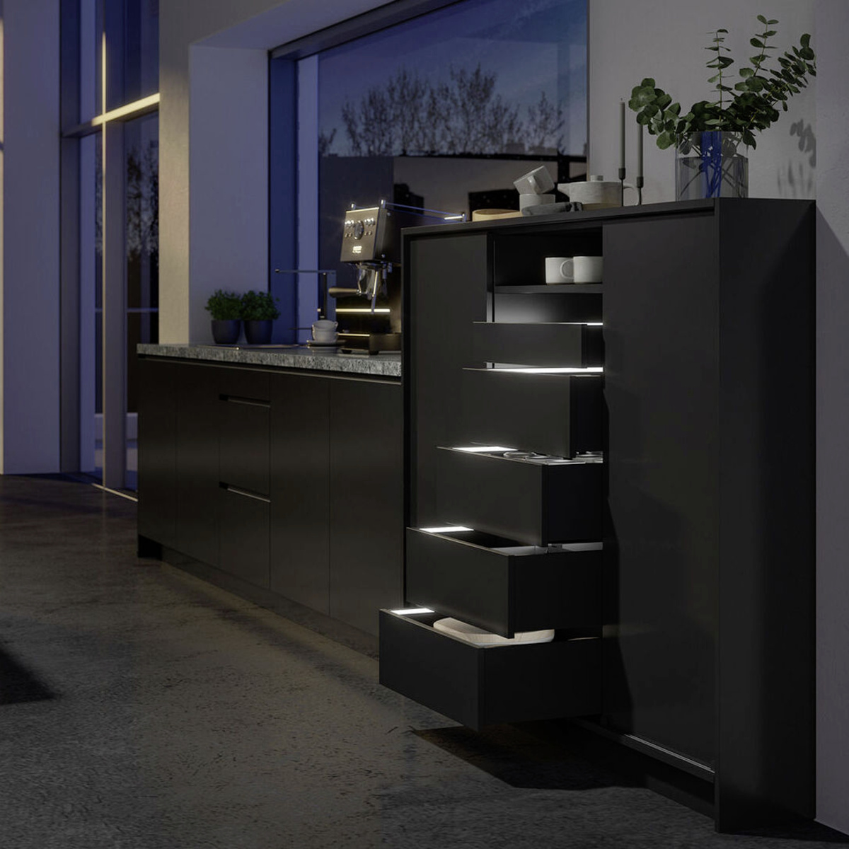 AvanTech YOU býður upp á ljósaútfærslu sem sameinar háþróaða LED-tækni og fagurfræðilega hönnun. Með snjöllum „smellt-á“ prófílum sem festast beint á hliðar skúffunnar er hvorki þörf á rafmagnstengli né rafvirkja. Ljósin kvikna sjálfkrafa þegar skúffan opnast og slokkna aftur eftir stutta stund.