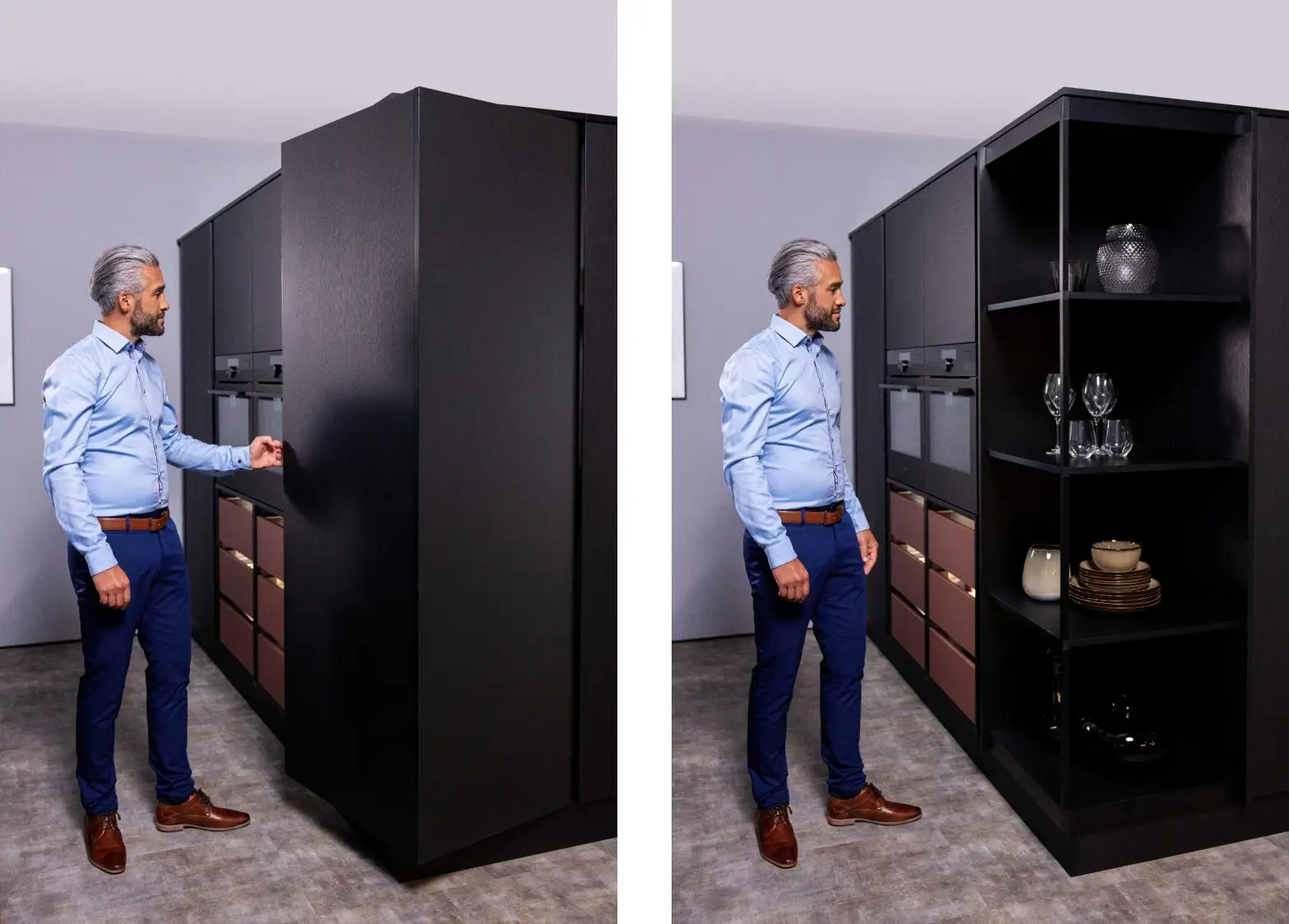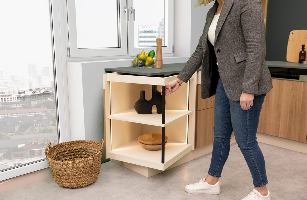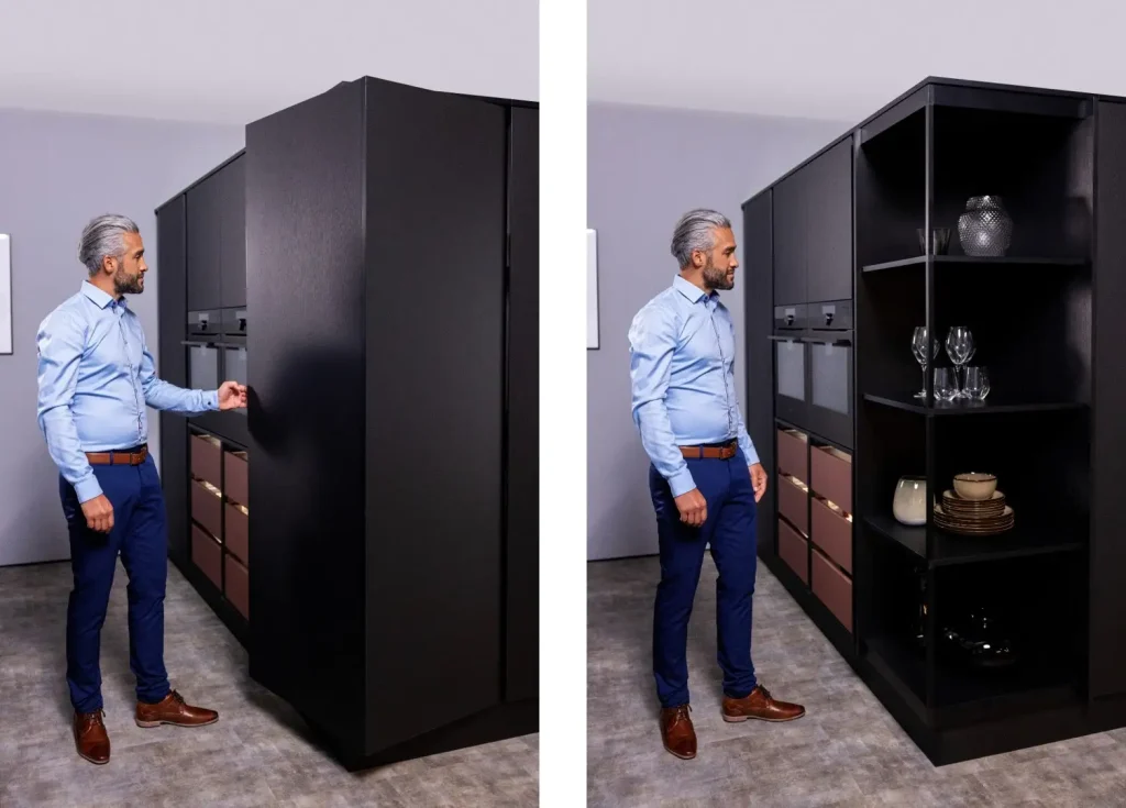 FurnSpin hentar vel í eldhús, stofur, baðrými, skrifstofur og fleiri rými þar sem markmiðið er að nýta pláss vel og skapa vandaða, nútímalega og eftirminnilega lausn.