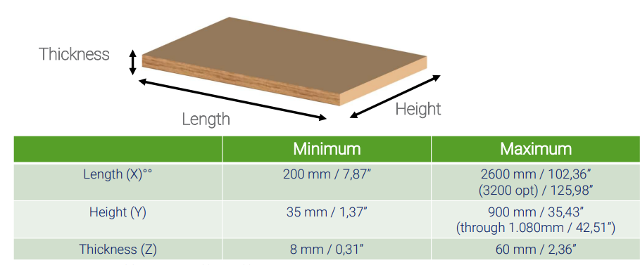 - Stærð vinnslustykkja hámark 2600x900x60mm, lágmark 200x35x8mm