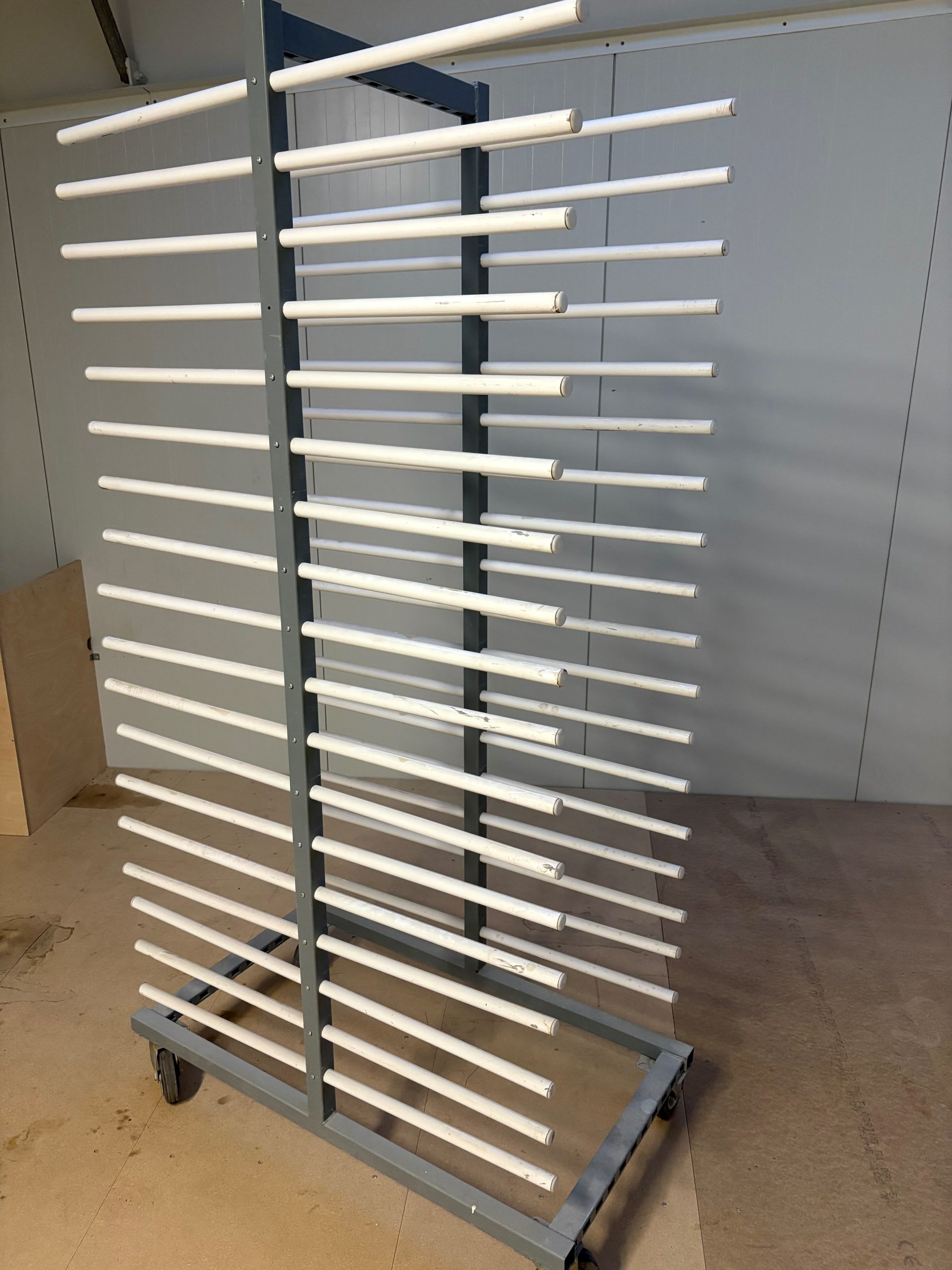 Heimasmíðaður notaður lakkrekki á hjólum, hentugur til þurrkunar á lökkuðum hlutum og plötum. Traust grind og margir armar fyrir upphengingu.